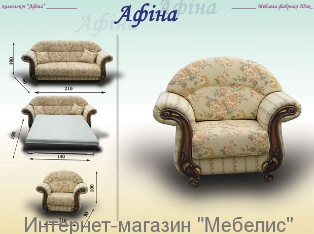 Комплектация "Афина": диван, кресло.Также компания разработала новые модели мягкой мебели у которых в основу входят ортопедические раскладушки, изготовленые в Италии, которые обеспечат удобное разложение, прочность и качество конструкции, а также гарантируют здоровый и комфортный сон человека. Также "Шик" использует деревянную фурнитуру собственного производства, которая улучшает внешний вид мебели, а также позволяет разнообразить дизайн продукции, что делает ее уникальной. «Шик Галичина» использует скобы, выездные механизмы, петли и т.д.от различных ведущих фирм украинского, а также зарубежного рынка, пользуясь при этом услугами только проверенных годами партнеров, гарантирующих высокое качество выпускаемой продукции. В основу мягкой части мебели фабрика "Шик" использует блок-пружины, изготавливаемые по спец. заказу из высококачественного сплава металлов. В основу входит евробанель, которая соответствует европейским стандартам и обеспечивает мягкость, а также гарантию комфортного и долговечного пользования.