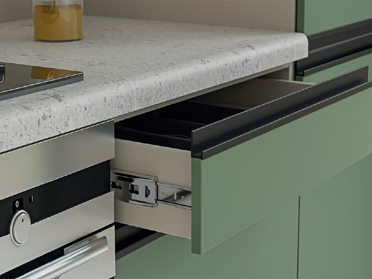 Кухни «Гарант» производятся из качественных материалов, отличающихся износостойкостью, прочностью и долговечностью. Корпус мебели серии «Альфа» – ДСП. Всего доступно 7 цветов: нимфея альба, кашемир, дуб крафт золотой, серая мышка, дуб сонома, серый графит, венге магия. Следует акцентировать на том, что в стандартную комплектацию входит вся необходимая фурнитура. Для выдвижных ящиков в комплект входят телескопические направляющие, обеспечивающие плавный ход механизма.