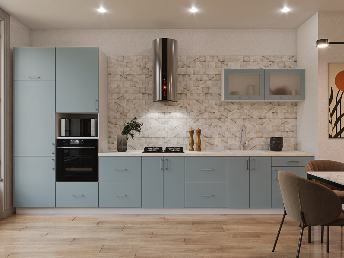 Модульная кухня «Горизонт» - мебель, соответствующая стандартам и отличающаяся длительным сроком эксплуатации. Фасады производятся из ЛДСП. В коллекции представлено 12 цветов. К примеру, рокфорд светлый, серая глина, голубой прибой или индастриал. Что касается выбора цвета фурнитуры, есть 16 вариантов.