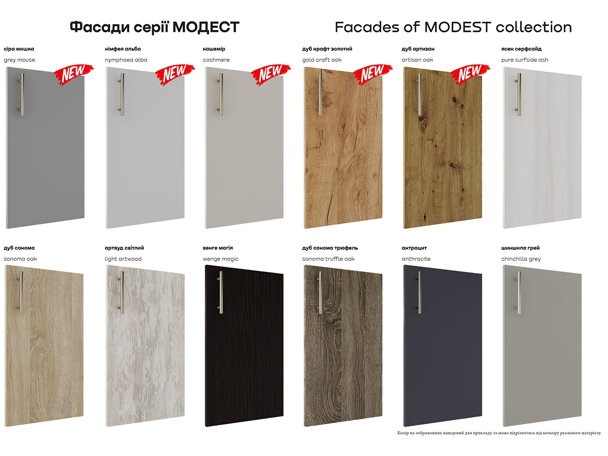 В ассортименте фабрики Гарант существует бюджетная серия кухонь Модест с фасадами из ДСП. Такой фасад покрыт ламинатом под структуру дерева или является просто однотонным: