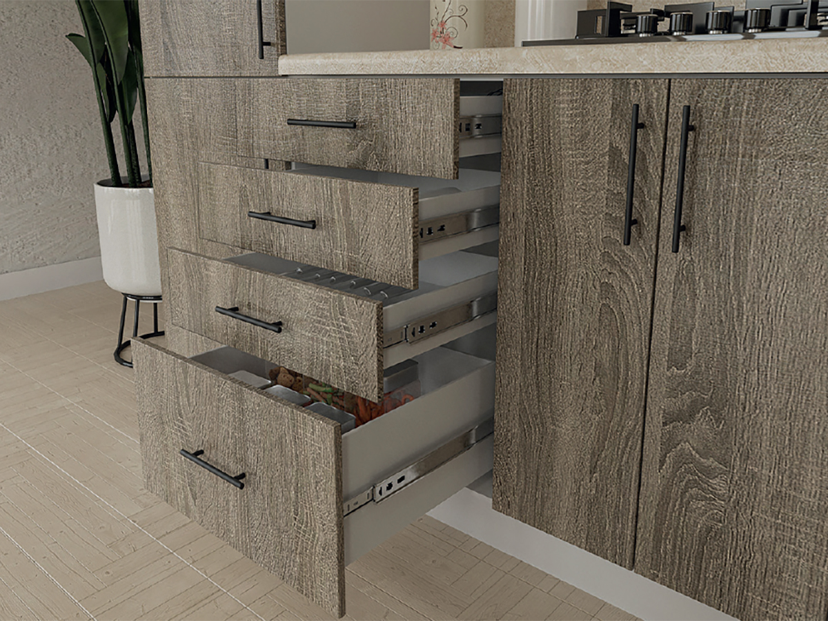 В стандартную комплектацию корпусов входит вся фурнитура, необходимая для полноценного функционирования кухни. В комплект выдвижных ящиков включены телескопические направляющие, которые обеспечивают полное выдвижение самого ящика и плавный ход механизма.