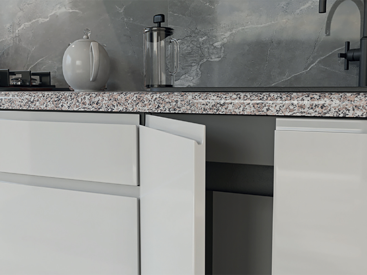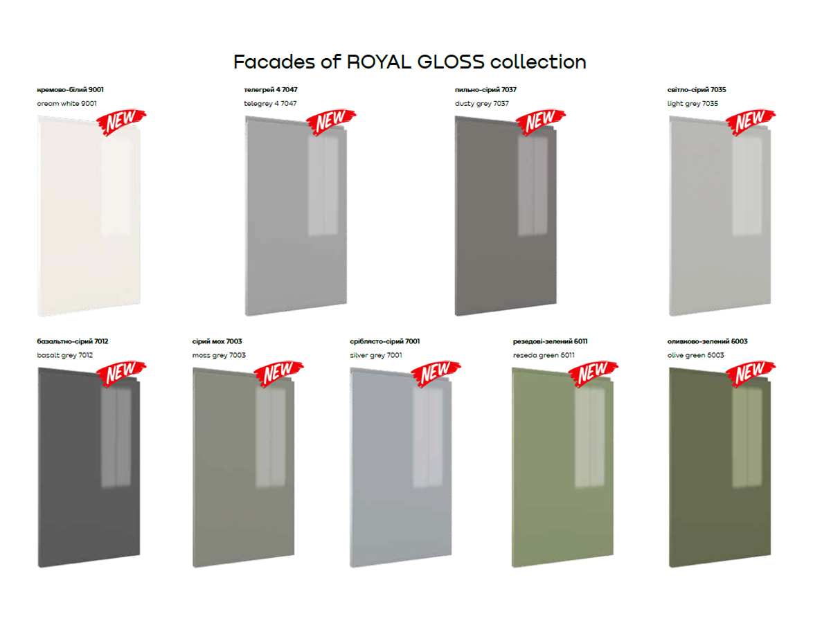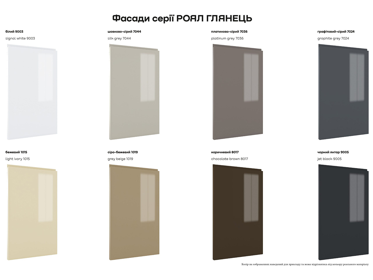 Модульная кухня серии «Роял глянец» - мебель, на которую мы рекомендуем обратить особое внимание. Фасады производятся из глянцевого крашеного МДФ 19 мм с интегрированной ручкой. Данная модель доступна в 17 цветах. Выбор зависит от Ваших пожеланий и того, в каком стиле оформлен интерьер.