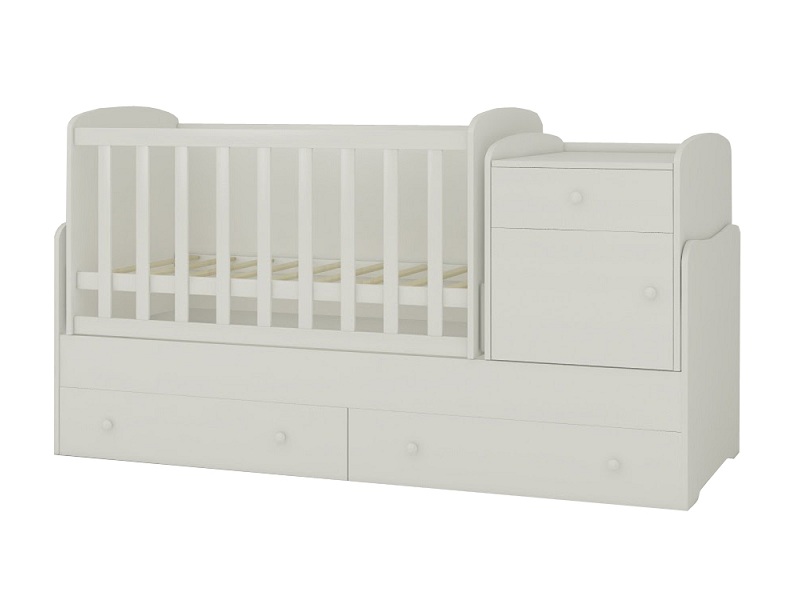 Кроватка трансофрмируется в кровать длинной 184 см и шариной 75 см.