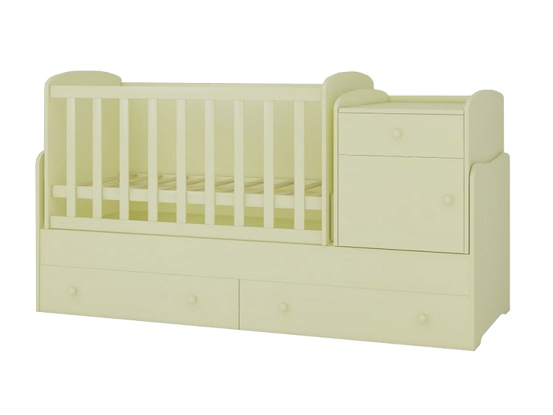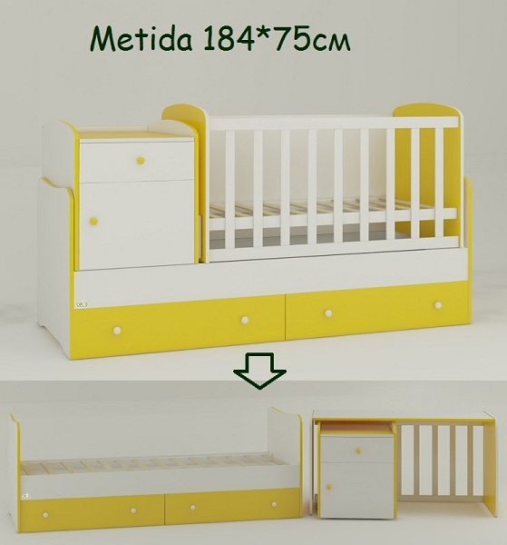Кроватка трансофрмируется в кровать длинной 184 см и шариной 75 см.
