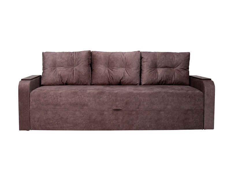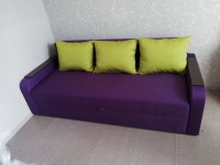 Купила очень яркий и симпатичный диван для гостиной Полина дуэт. Его фиолетовая обивка и салатовые подушки не оставили меня равнодушными, очень круто сыграно на контрасте несочетаемых, казалось бы, цветов. Диван прямой, по необходимости раскладывается двуспальное место для сна по типу механизма «еврокнижка». Наполнение пенополиуретановое, поэтому диван достаточно жесткий, отлично держит форму.