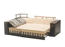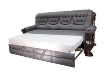 Диван дельфин включает в себя два элемента. Один – в выкатной части, второй – в сидении. Конструкция чаще всего выполняется из стали и монтируется на направляющие из дерева. Принцип работы простой. Из-под нижней части сидения выкатывается несколько блоков. Один из них находится внутри другого. Они позволяют создать надежный и просторный матрас.