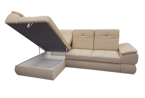 В угловой части конструкции расположена глубокая ниша, в которую можно убрать постельные принадлежности или другие необходимые вещи, что помогает поддерживать порядок в комнате. Модель выпускается в широком спектре расцветок и видов обивки, что позволяет подобрать вариант под любой интерьерный стиль.