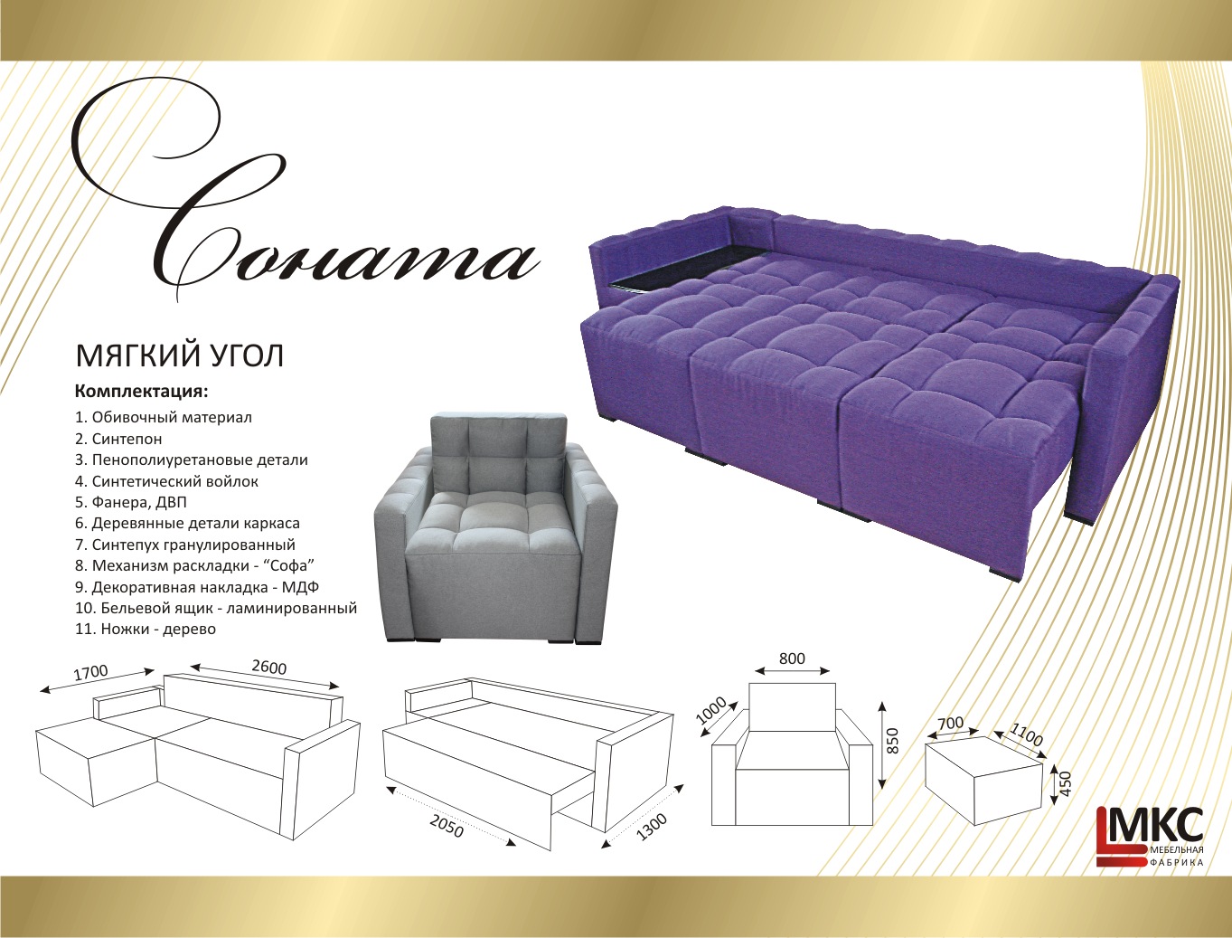 На спинке , и на сидушке использован поролон повышенной мягкости для более комфортного отдыха. Дизайн угла «Соната» классический, что выгодно выделяется среди других моделей. Подлокотники сделаны в виде вшитых подушечек. Подлокотники очень узкие ,что не увеличивает габаритный размер.