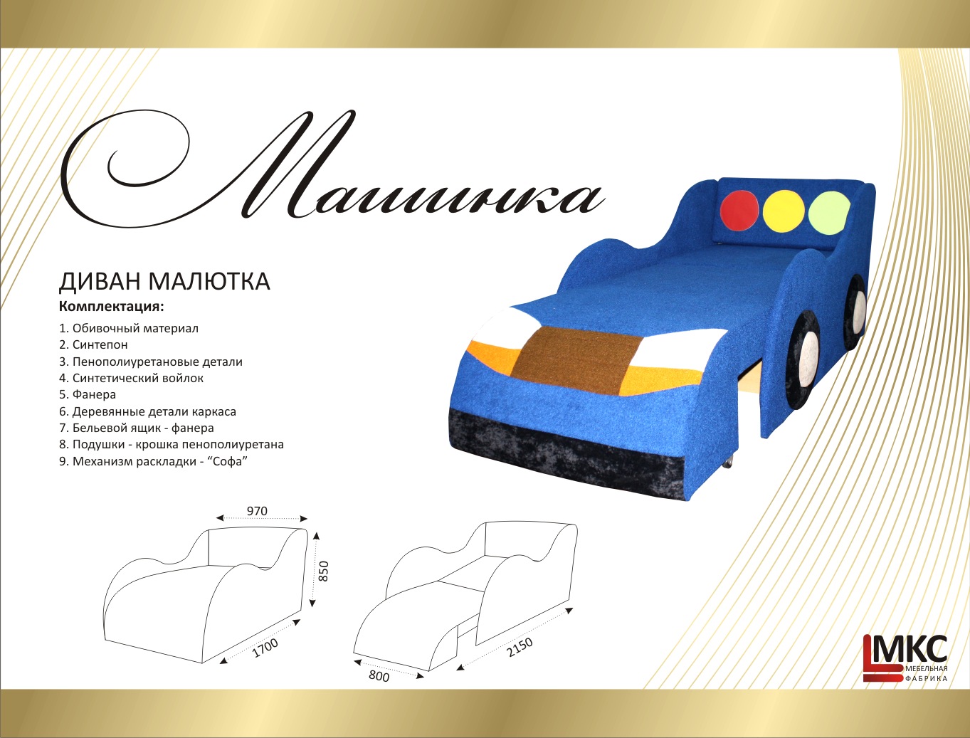 Диван Машинка – это диван для деток, который выполнен в виде гоночной машинки с колесами, фарами и бампером. Такая кроватка станет любимой игрой Вашего ребенка, даже те малыши, которые не хотели засыпать сами, теперь с удовольствием смогут засыпать на этом диванчике. Ребенок засыпая на этой кровати-ощутить себя героем этого мультфильма.