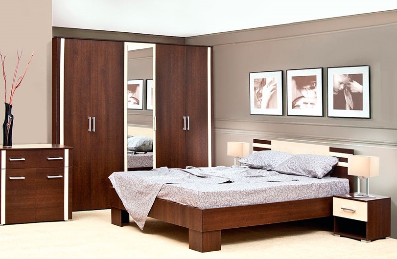Спальня набирается посекционно, что дает возможность купить только нужные модули. На выбор предоставляется два вида шкафов трехдверный и пятидверный, двухспальная кровать, зеркало, прикраватная тумбочка и комод.