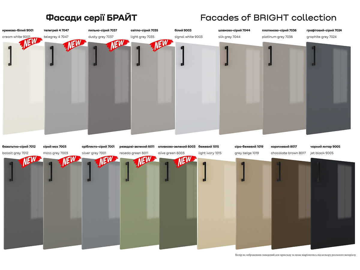 Модульна кухня серії «Брайт» - меблі, що виготовляються відповідно до стандартів та з високоякісних матеріалів. Український виробник приділяє увагу найменшим деталям, використовує інноваційні технології та йде в ногу з часом. Фасади меблів виготовляються з глянцевого фарбованого МДФ. Модульні системи серії «Брайт» доступні в 17 кольорах, серед яких варто відзначити оливково-зелений, пильно-сірий, кремово-білий і чорний янтар. Також можна обрати фурнітуру з 16 запропонованих варіантів.