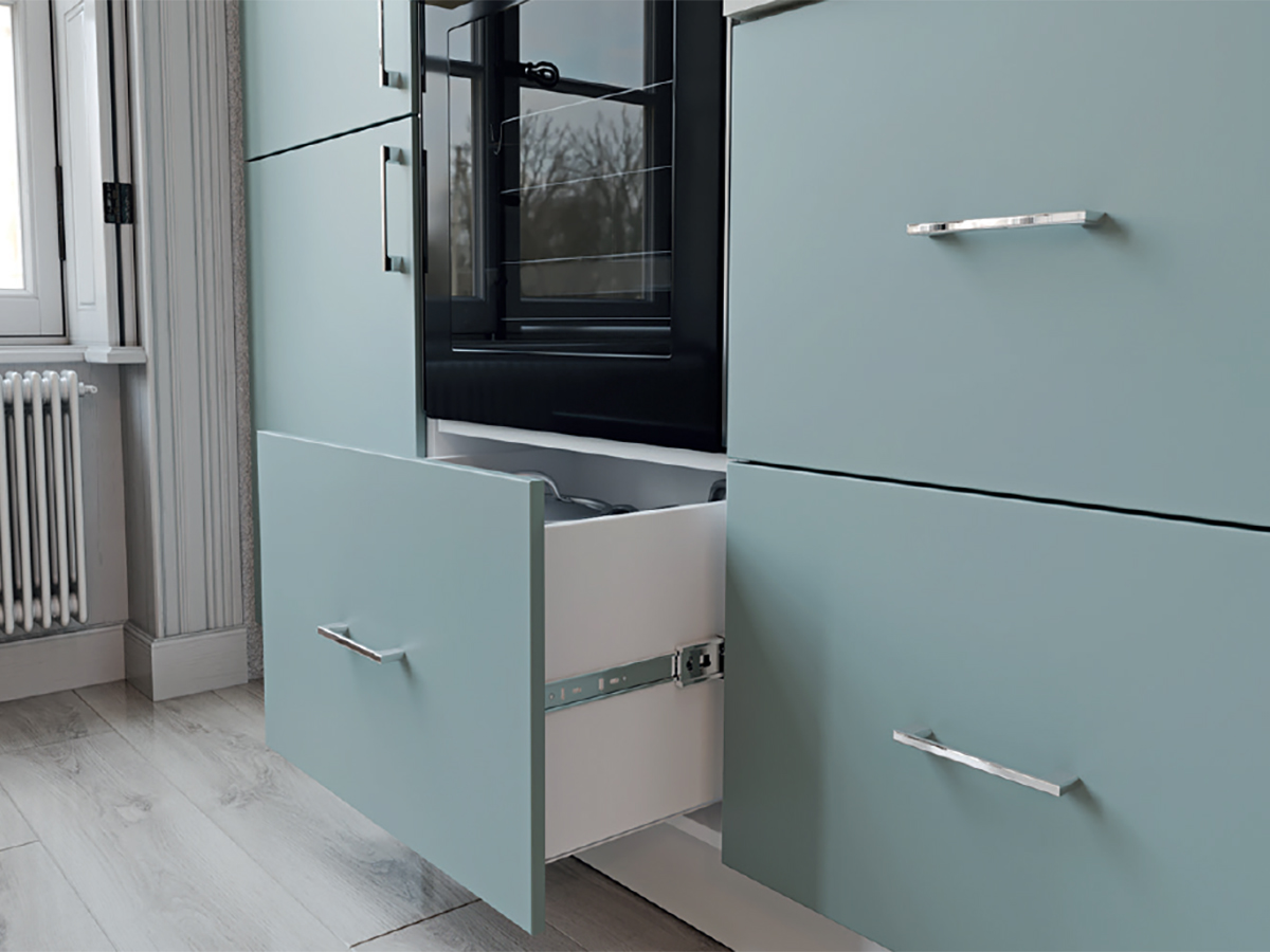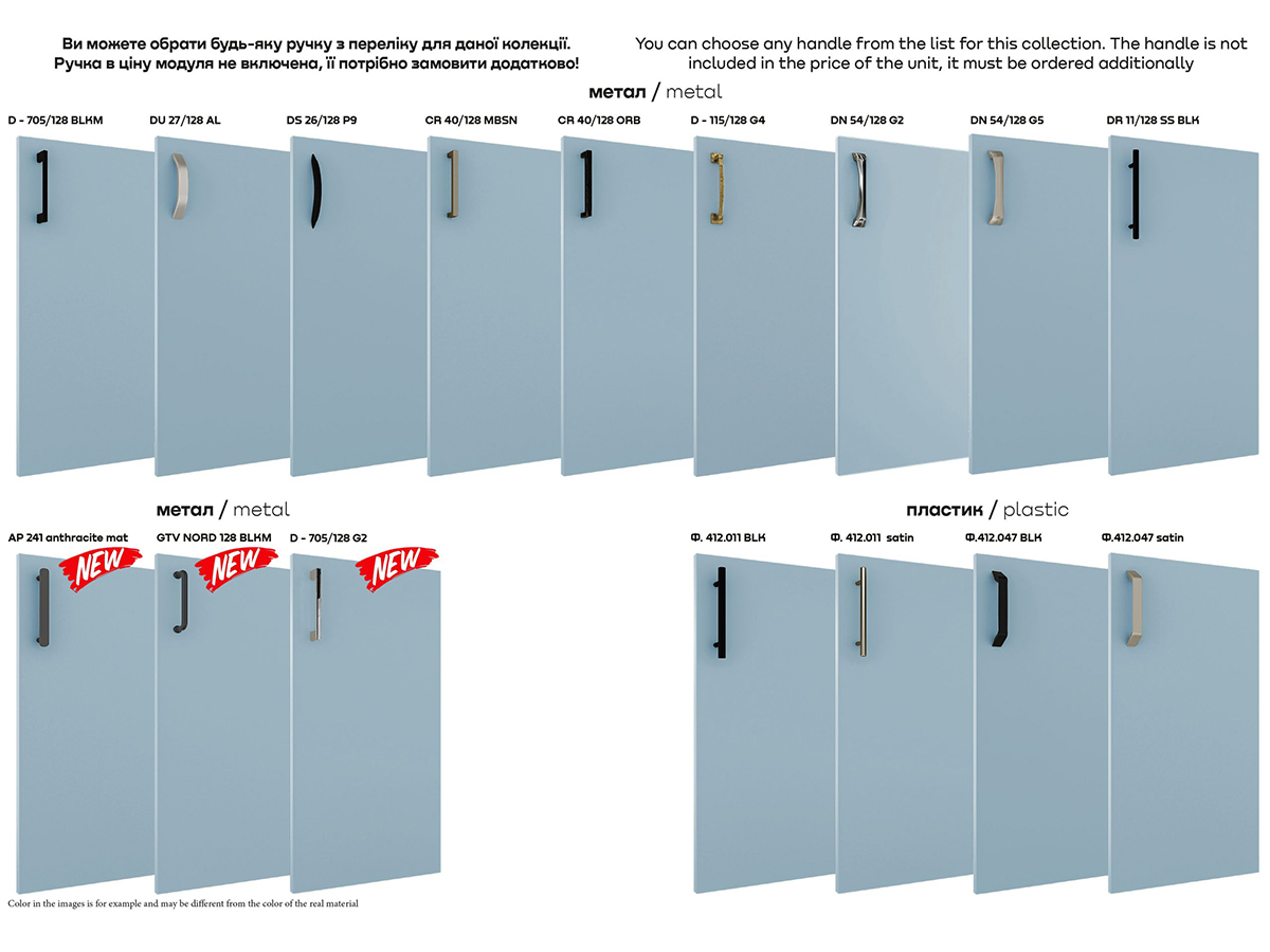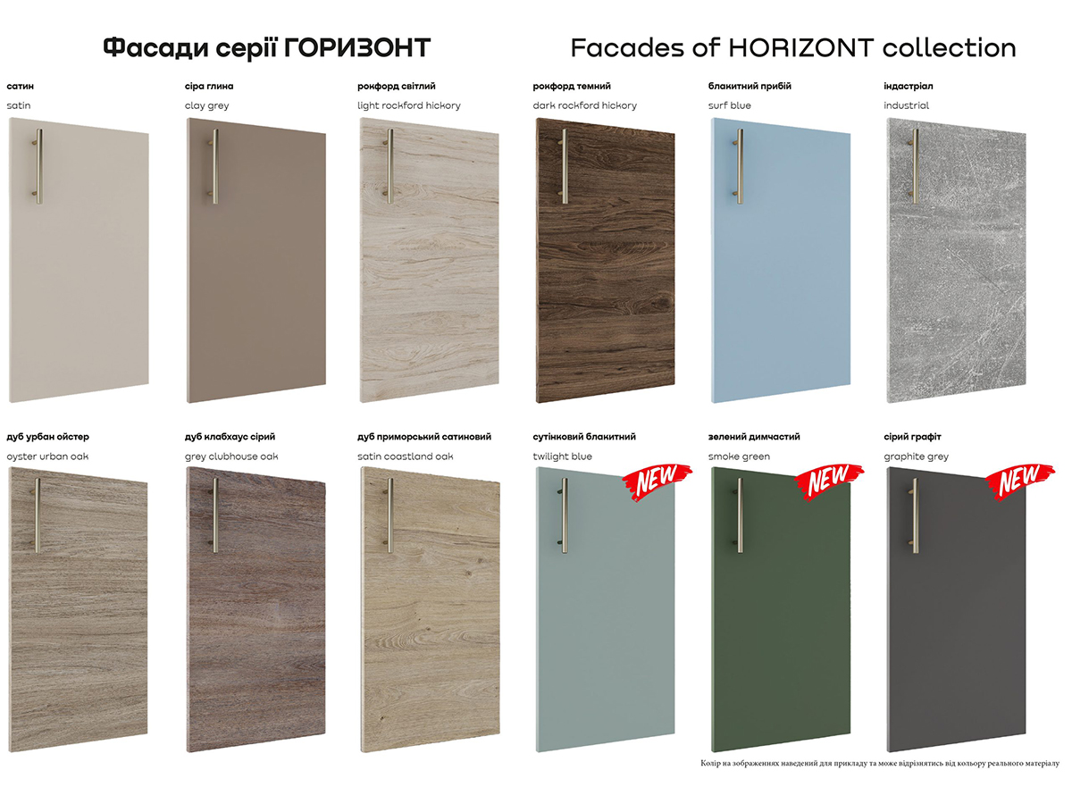 Модульна кухня «Горизонт» - меблі, що відповідають стандартам та відрізняються тривалим терміном експлуатації. Фасади виготовляються з ЛДСП. В колекції представлено 12 кольорів. Наприклад, рокфорд світлий, сіра глина, блакитний прибій чи індастріал. Що стосується вибору кольору фурнітури, є 16 варіантів.