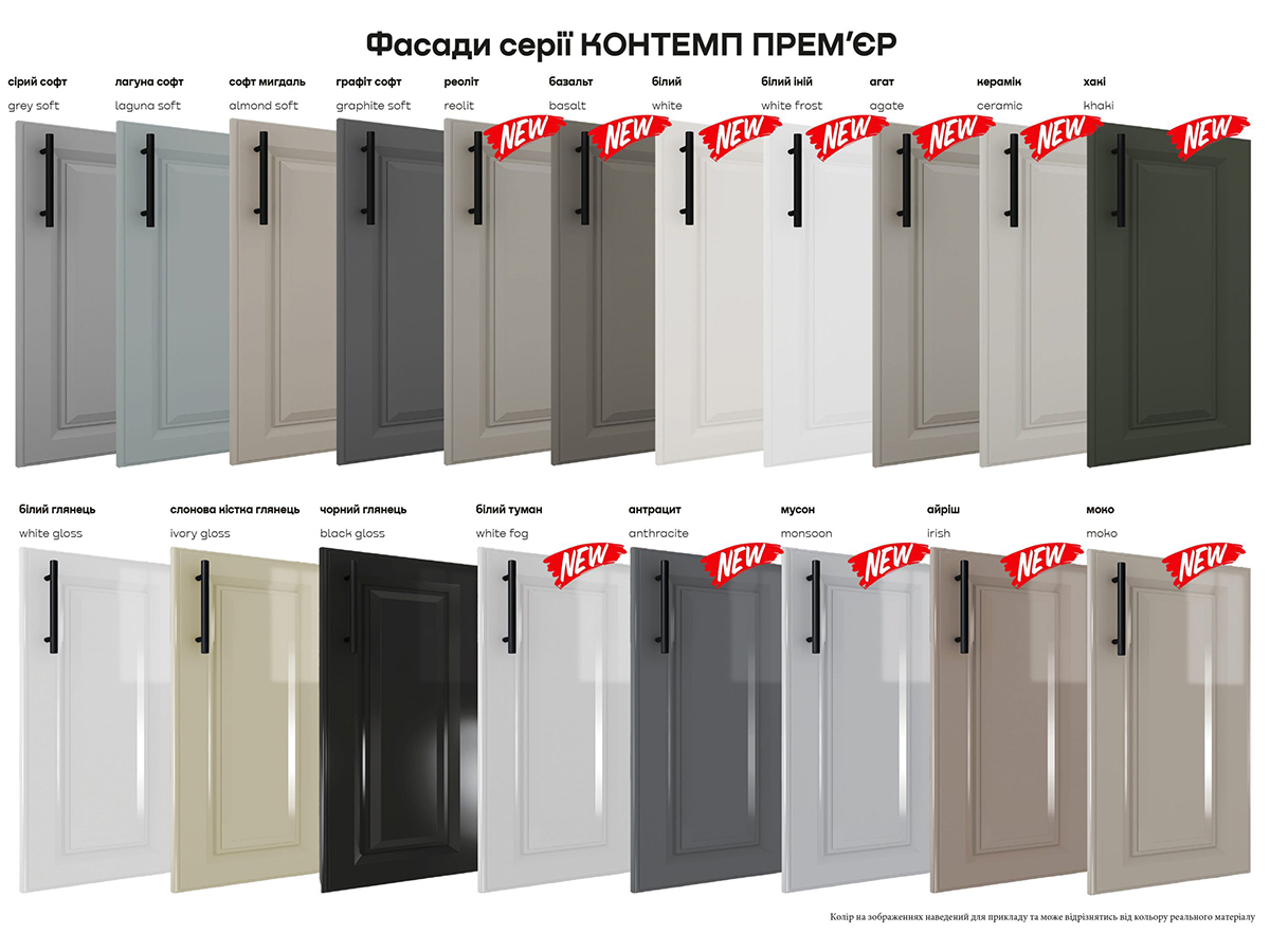 Кухня «Контемп Прем’єр» — це вдале поєднання сучасного стилю та практичності для тих, хто цінує високу якість і витончений дизайн. Фрезеровані фасади у поєднанні з актуальними матеріалами надають серії елегантного вигляду й роблять її чудовим рішенням для оформлення інтер’єру, наповнюючи кухню затишком та вишуканістю. Фасади цієї серії виготовляються з плити МДФ завтовшки 16 мм, вкритої ПВХ-плівкою, та оздоблюються витонченою фрезерівкою «Прем’єр», що підкреслює елегантність кухні. Колекція представлена у 31 відтінку, серед яких 12 абсолютно нових, що відкриває широкі можливості для гармонійного облаштування будь-якого інтер’єру.
