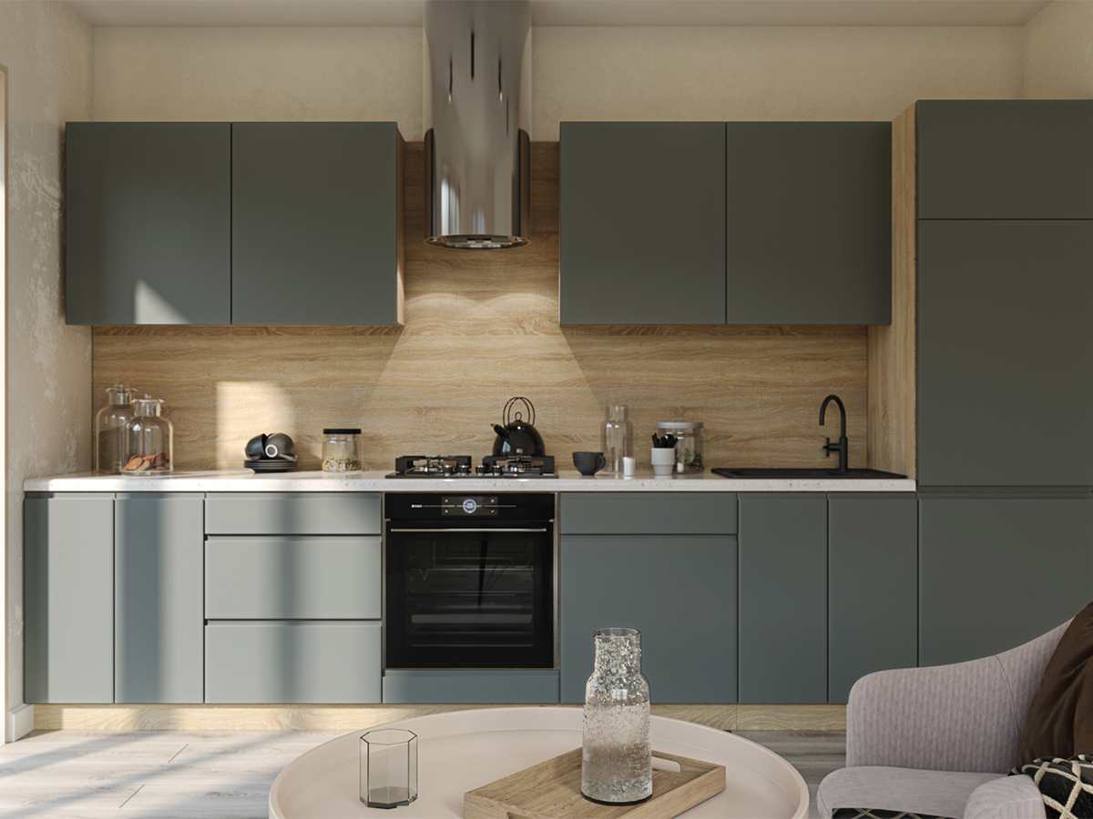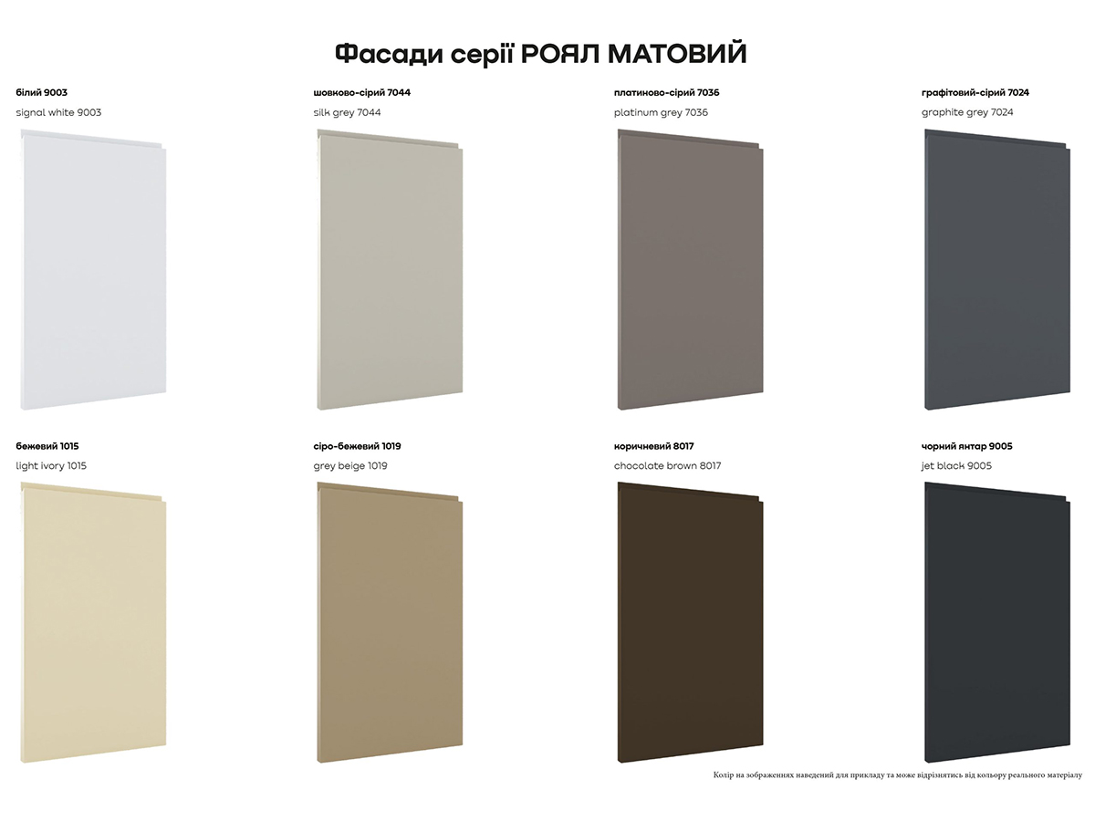 Кухні модульні серії «Роял матовий» - меблі, виготовлені з використанням сучасних технологій та відповідно до стандартів. Фасади виготовляються з матового фарбованого МДФ 19 мм з інтегрованою ручкою. Модульна кухня «Роял матовий» доступна в 17 кольорах.